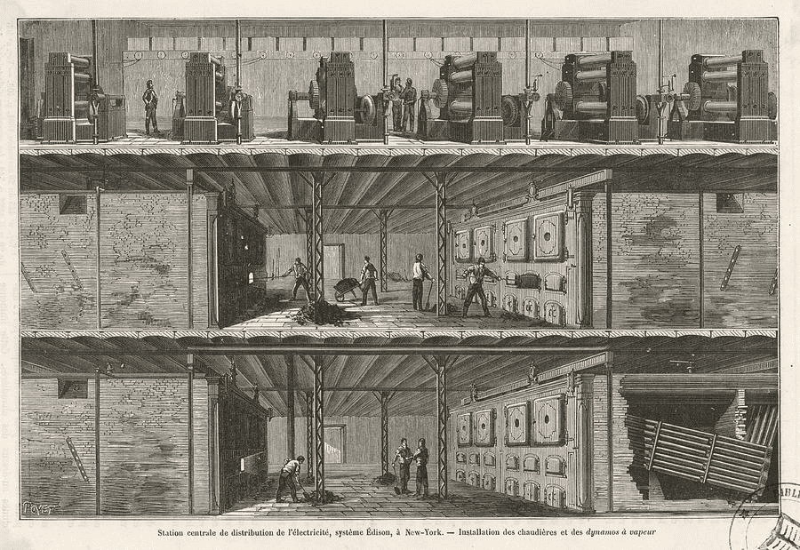The situation with lighting was resolved with the appearance of the American inventor Thomas Edison in Manhattan. He offered to the citizens incandescent lamps invented by him in 1879. To demonstrate their system of work, Thomas built his power plant on Pearl Street in Lower Manhattan in 1882, which became a real engineering miracle. The station had six volumetric dynamo machines, which, in turn, produced direct current with the help of a steam engine. Thus, the produced current ran to consumers through underground cables. Since its launch, Thomas Edison’s lighting system has been deemed successful. In general, in the early years, the station nourished the so-called First District, where the power plant itself was located. Subsequently, due to the availability and high quality, the number of customers significantly increased. By the end of 1882, the station had more than 500 customers, including various enterprises, houses, streets, etc.