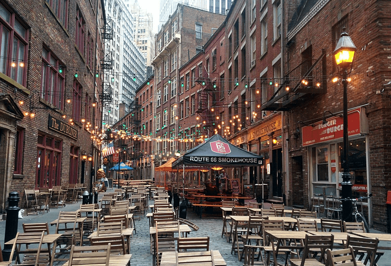 Stone St in Manhattan is a short street in the middle of the financial district of NYC. The street is on the territory of two sections between such streets as Whitehall on the western part and Hanover Square on the eastern part. This street was founded as a straight roadway from the neighboring Whitehall and Hanover Square, but later it changed its function due to the elimination of the section between Broad St and Coenties Alley in 1980. This was done for the Goldman Sachs building project at 85 Broad St. Read more on manhattan-future.